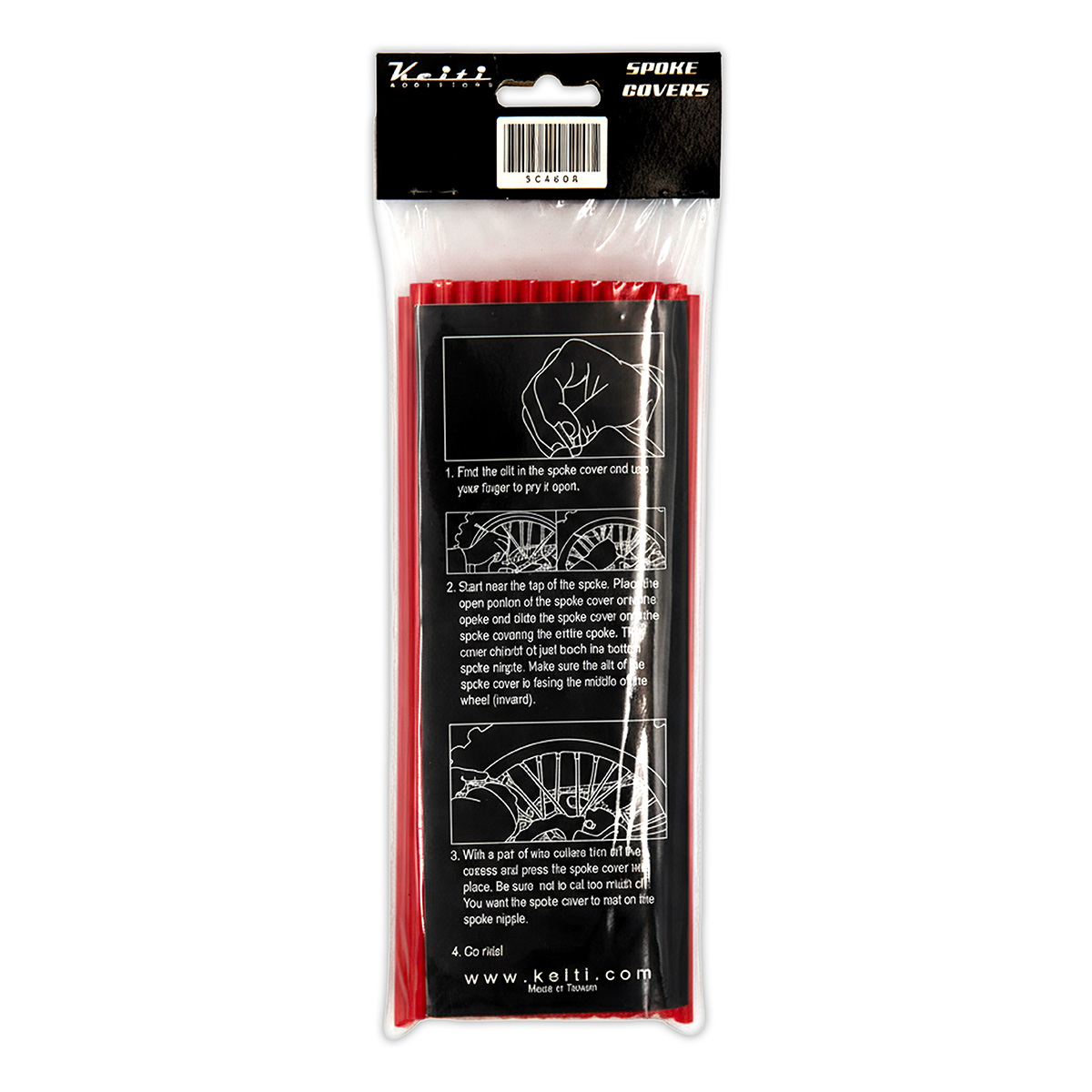 Flexible, pre-cut 215 mm PE covers that snap on tool-free to bicycle and motorcycle spokes, protecting against dirt and corrosion while adding vibrant, customizable colours.