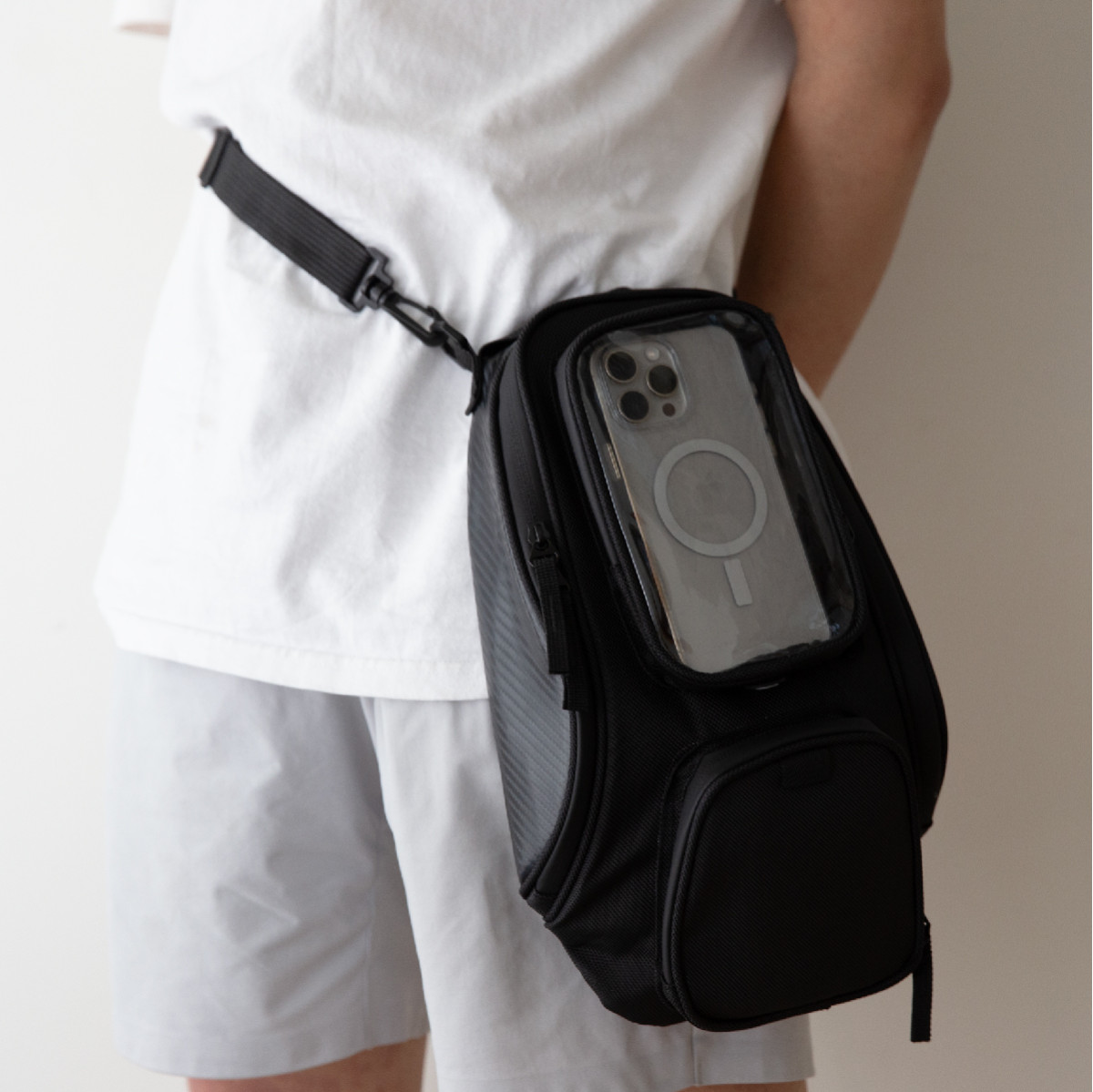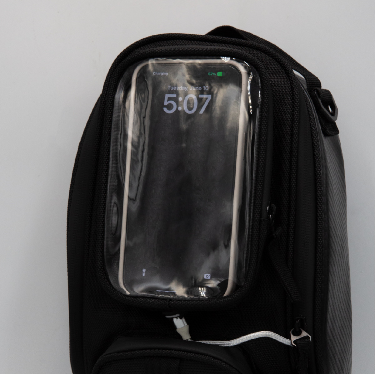 Its integrated transparent top pocket supports touchscreen navigation and features a concealed cable port for charging or earphones. When you reach your destination, the quick-release shoulder strap transforms the tank bag into a stylish messenger bag for easy carrying.